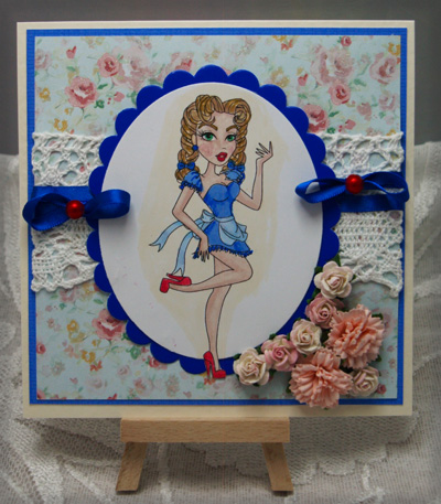 I teamed her up with some delish Lucy Cromwell paper and added some lace and ribbon to bring her colours out. I added a few flowers too!!